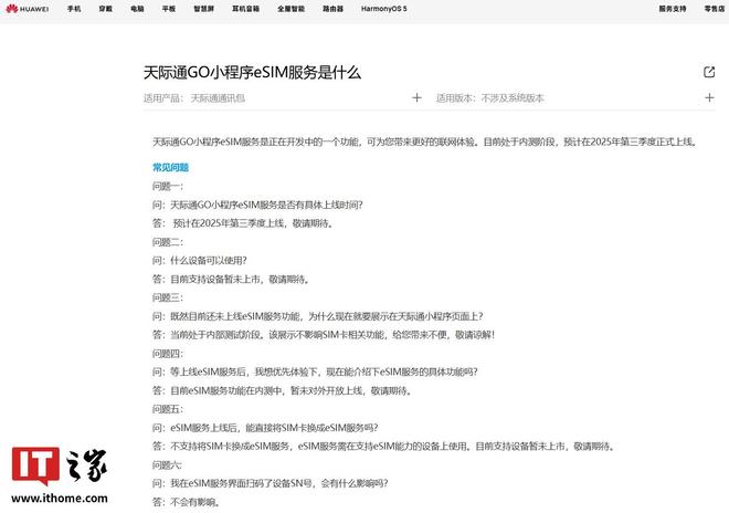 IT之家注意到,华为官网现对天际通 GO 小程序 eSIM 服务进行说明,称其是正在开发中的一个功能,可带来更好的联网体验。目前处于内测阶段,预计在 2025 年第三季度正式上线。常见问题如下:
